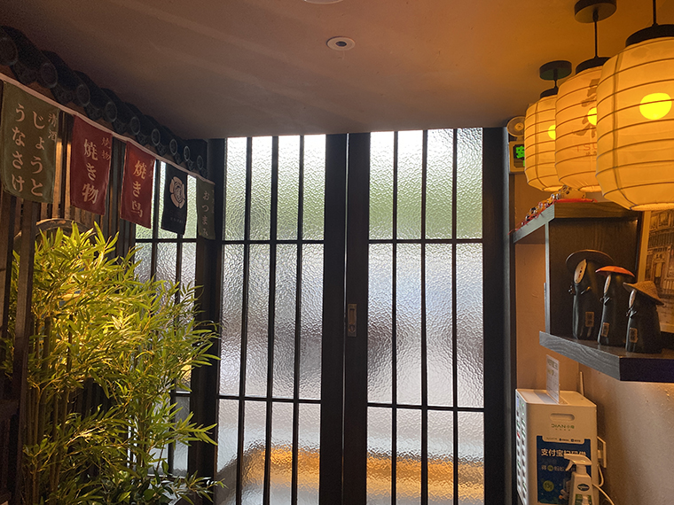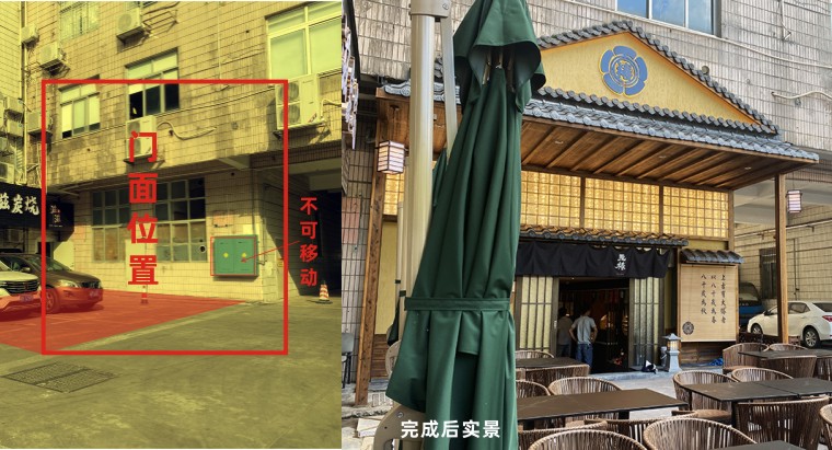 門口的日式推拉門、地燈、青石板、椿花樹、炭黑色的日式布簾、遮蓋燃氣表箱體的竹制卷簾,整個門頭把日本京都特征表達地非常鮮明且形式經典,識別度極高。