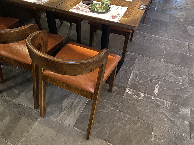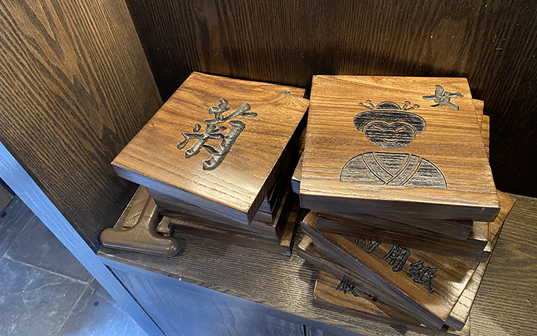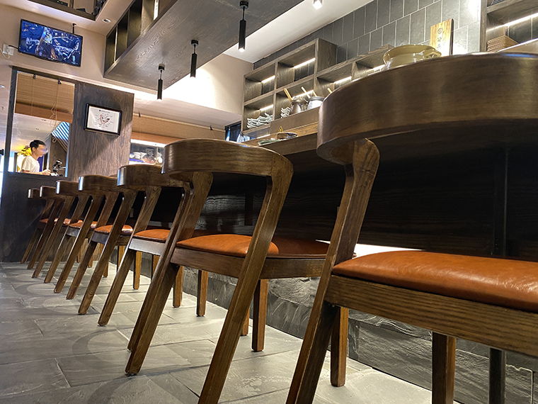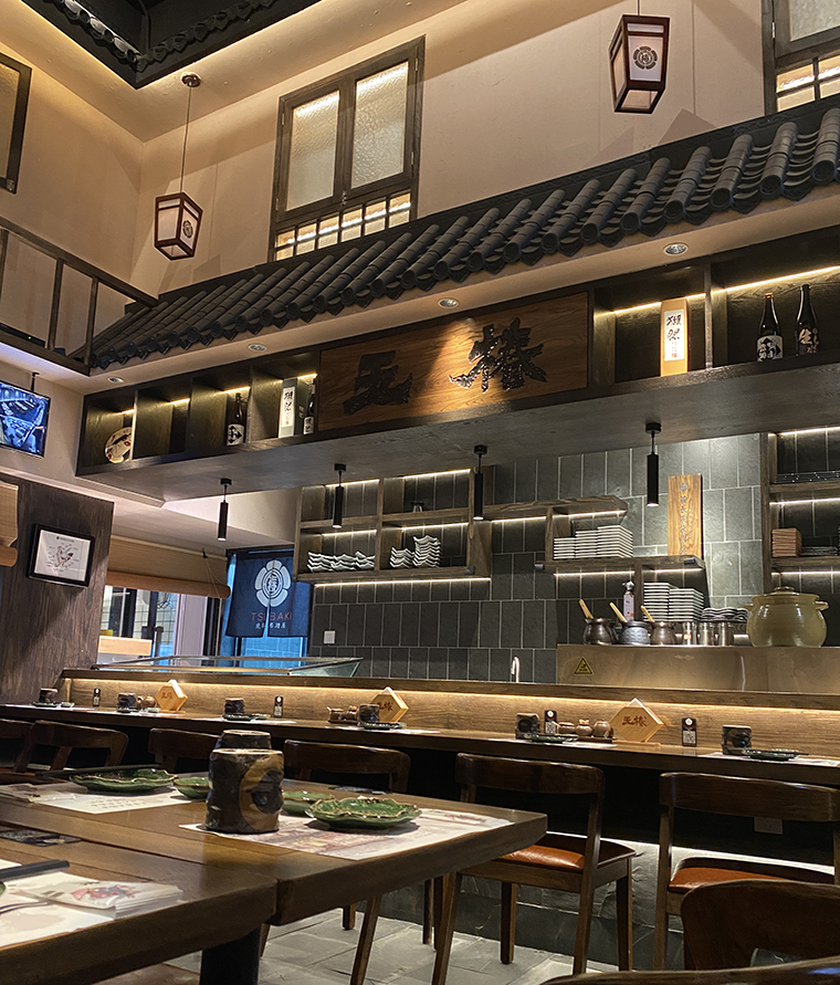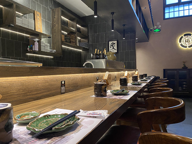 為了營造京都風格的空間感受,品深餐飲為玉椿設計定制的家具采用了實木材質,開放漆做舊工藝處理,呈現出一種江戶時代的歷史滄桑質感;與門店的招牌匾額,儲存柜顏色完全一致,顧客使用時候的歷史體驗感更為強烈