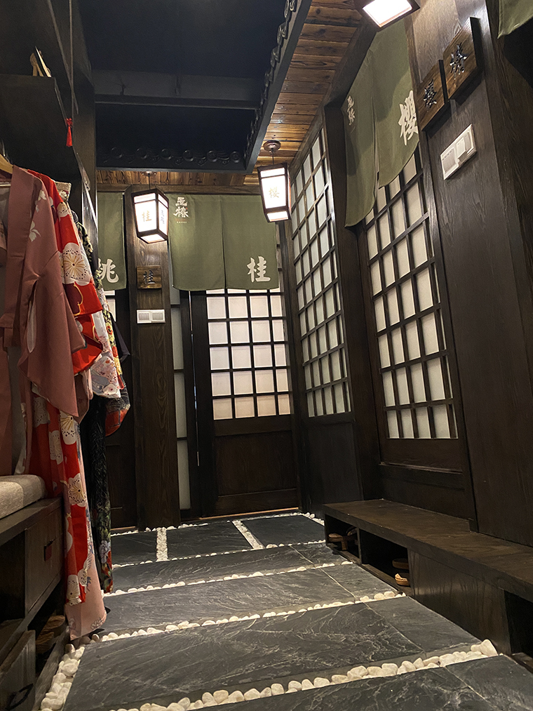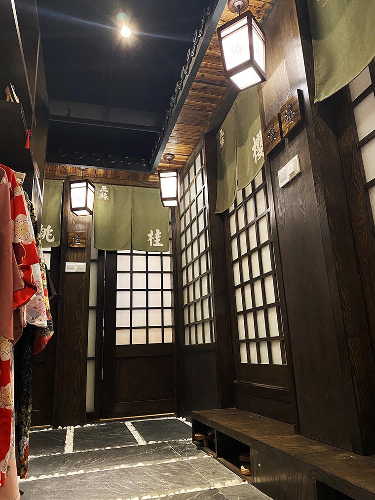 二樓除了必備的洗手間、儲物柜外,還設置了和服展示區,這是餐飲娛樂化的一大重要趨勢。很多女性消費者在日本料理店消費時喜歡穿著和服自拍分享,彰顯個性也很有趣味,可以很好地把我們玉椿品牌傳播出去。品深餐飲設計就順應這種潮流趨勢,擁抱變化,主動設置拍照打卡區,讓消費者傳頌。