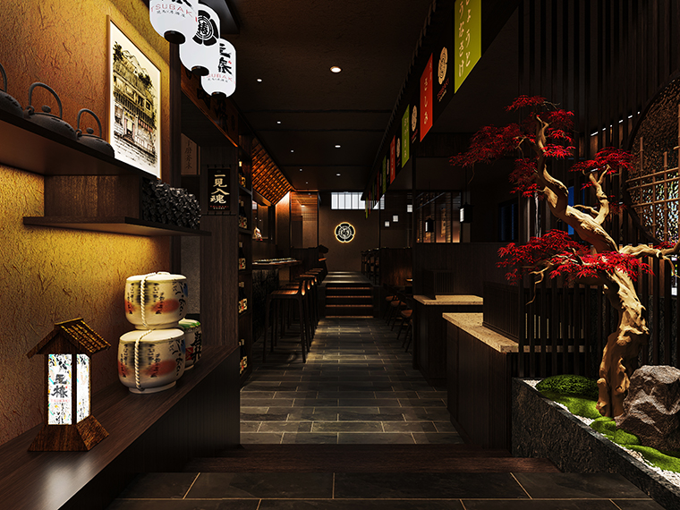 京都是日本人的精神故鄉,是日本文化的源點,是日本的文化象征之地。京都是根據歷來王朝文化中盛行的日本式唯美意識所構建的。以神社、佛閣等歷史建筑物、庭院、繪畫、傳統活動、京都料理為代表,被稱為“千年古都”。我們發現京都是日本古建筑保留最完整,古跡留存最多的城市,名勝古跡,數不勝數。玉椿要傳達京都味道,地域文化就是美食地道的證明。我們從門頭開始到天花吊頂、地面鋪設、墻面涂料、燈光、家具等各方面圍繞“京都味道、匠傳玉椿”來展開步移景異,一步一景的空間效果圖設計。