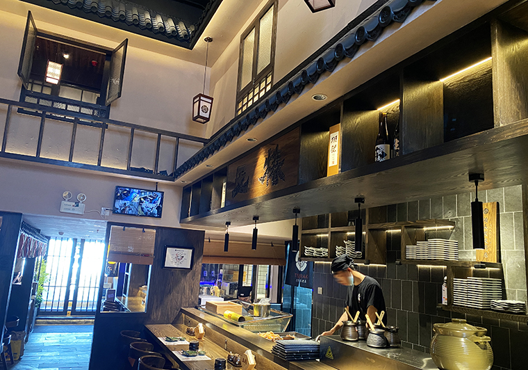 2、一樓大廳及吊頂的設計把京都的古老街道,巷子搬到我們店里。整個大廳的頂部環繞一圈日式黑瓦頂,四周幾個日式玻璃木窗,與地面的青石瓦面,墻體的稻草漆,燒烤吧臺形成一體化的京都風格。置身其中,仿佛漫步于京都的古老美食街道中,熙熙攘攘,熱鬧非凡,抬頭間還能看見二樓的日本侍女正在推開窗戶,朝著樓下觀望。