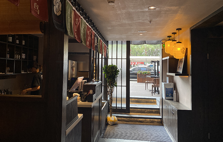 玉椿燒鳥居酒屋首店位于深圳的餐飲網紅高地——車公廟十畝地正對面。門店之前是一家中餐的后廚的全部空間及部分包間,其中一半的面積屬于上一家餐廳自己搭建的二層。空間結構非常復雜,地面高地不平,尤其是搭建部分的1層,2層實際高度不到2.5米,心理感受很逼窄,這個場地極為考驗品深項目團隊中空間設計師的功力水平。