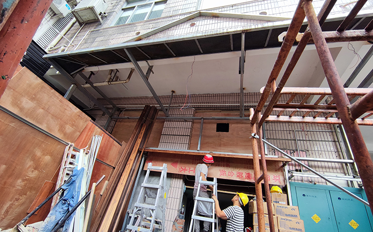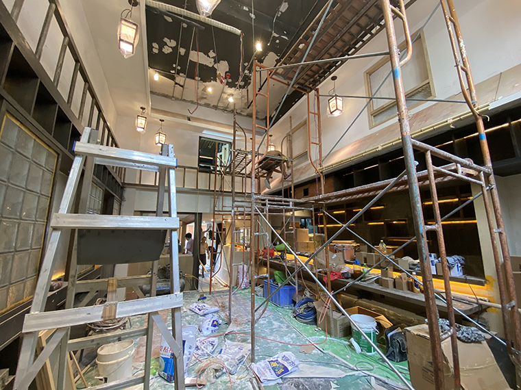 玉椿燒鳥居酒屋首店位于深圳的餐飲網(wǎng)紅高地——車公廟十畝地正對(duì)面。門店之前是一家中餐的后廚的全部空間及部分包間,其中一半的面積屬于上一家餐廳自己搭建的二層??臻g結(jié)構(gòu)非常復(fù)雜,地面高地不平,尤其是搭建部分的1層,2層實(shí)際高度不到2.5米,心理感受很逼窄,這個(gè)場(chǎng)地極為考驗(yàn)品深項(xiàng)目團(tuán)隊(duì)中空間設(shè)計(jì)師的功力水平。