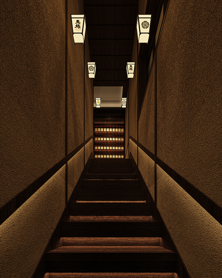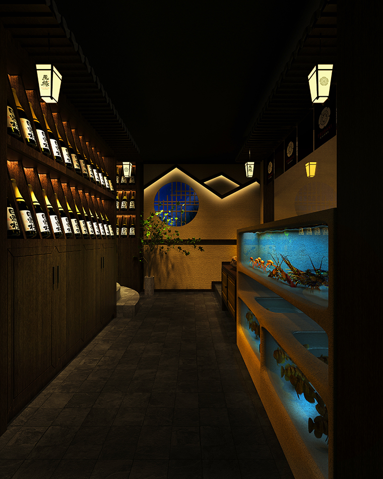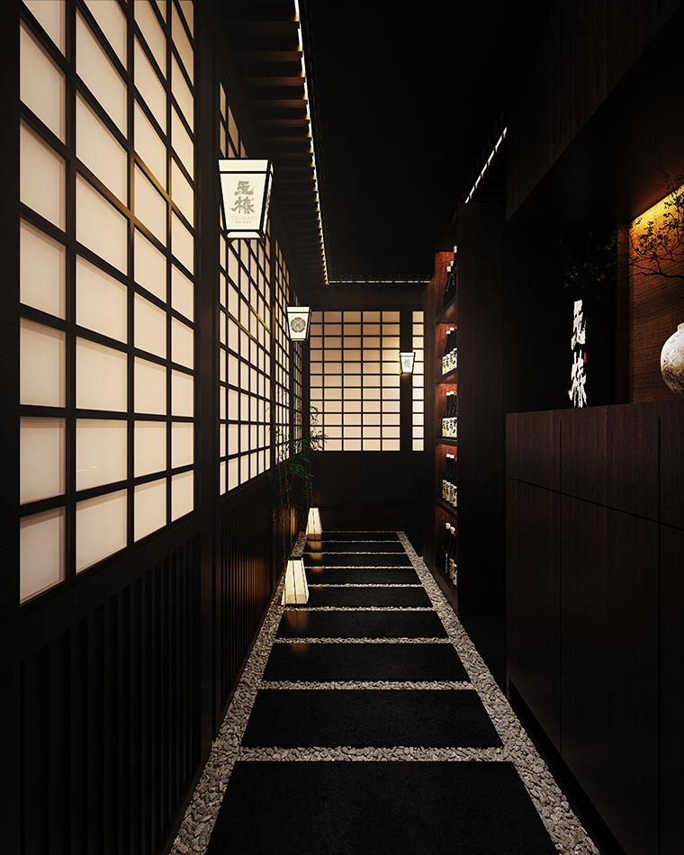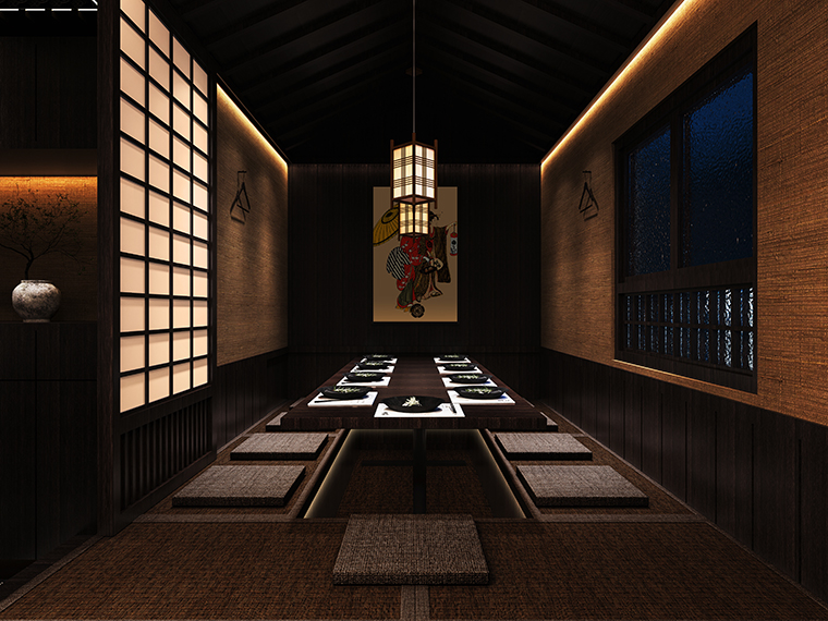 我們從門頭開始到天花吊頂、地面鋪設(shè)、墻面涂料、燈光、家具等各方面圍繞“京都味道、匠傳玉椿”來(lái)展開步移景異,一步一景的空間效果圖設(shè)計(jì)。