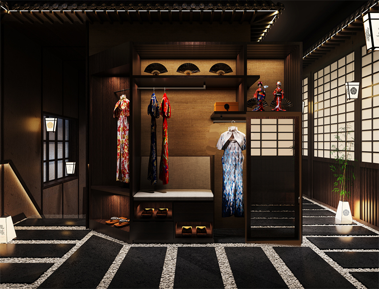 二樓除了必備的洗手間、儲(chǔ)物柜外,還設(shè)置了和服展示區(qū),這是餐飲娛樂(lè)化的一大重要趨勢(shì)。很多女性消費(fèi)者在日本料理店消費(fèi)時(shí)喜歡穿著和服自拍分享,彰顯個(gè)性也很有趣味,可以很好地把我們玉椿品牌傳播出去。品深餐飲設(shè)計(jì)就順應(yīng)這種潮流趨勢(shì),擁抱變化,主動(dòng)設(shè)置拍照打卡區(qū),讓消費(fèi)者傳頌。
