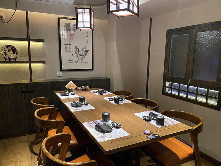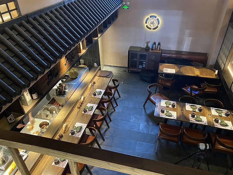 最能體現(xiàn)居酒屋熱鬧感的是大廳,最能感受燒鳥店煙火氣的是燒烤臺(tái)前的長(zhǎng)吧臺(tái)。當(dāng)我們坐在燒鳥長(zhǎng)吧臺(tái)前,看著燒鳥師傅熟練地穿串,精準(zhǔn)地控制火候,不時(shí)地翻動(dòng)烤串,美味現(xiàn)場(chǎng)呈現(xiàn),匠傳玉椿的理念就鮮明直觀地傳達(dá)出來(lái)了。所以,整個(gè)大廳都是圍繞著燒烤吧臺(tái)這一焦點(diǎn)而展開的,全部為單人椅及兩人座位,位置靈活組合,利用率非常高。
